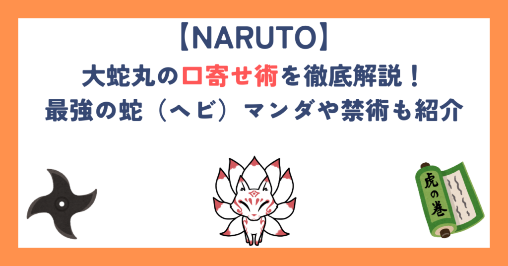 伝説の三忍・大蛇丸を象徴する、不気味で強力な「口寄せの術」。 巨大な蛇(ヘビ)を従える姿は圧巻ですが、その術の奥深さは計り知れません。 最強と謳われた口寄せ蛇... バトル・アクション【ナルト】大蛇丸はいいやつ?改心した(丸くなった)理由と最後を解説